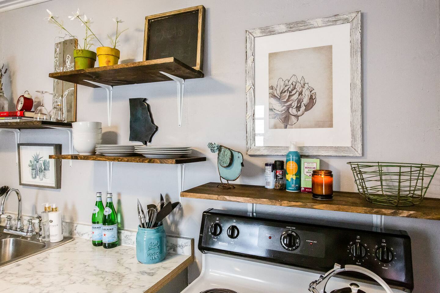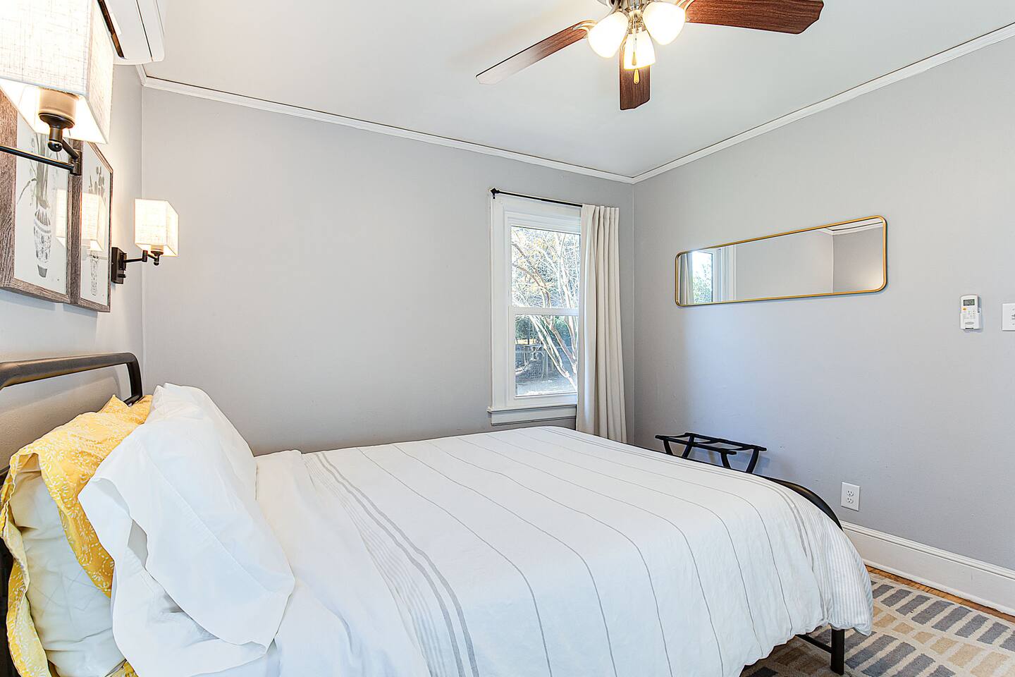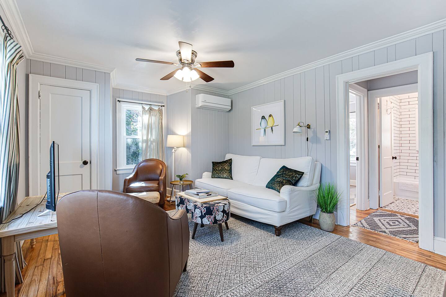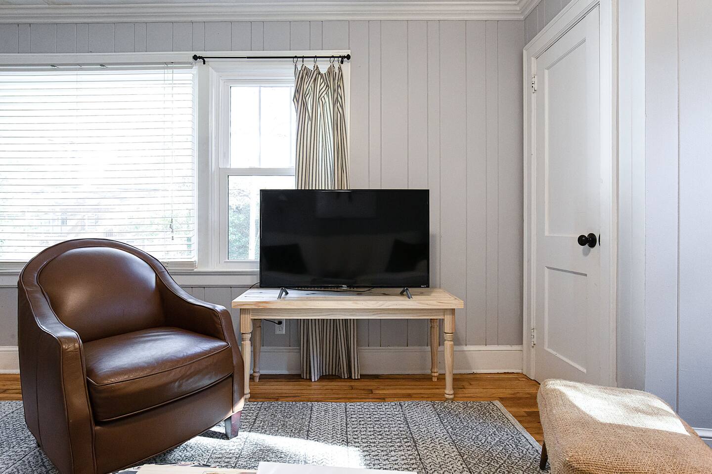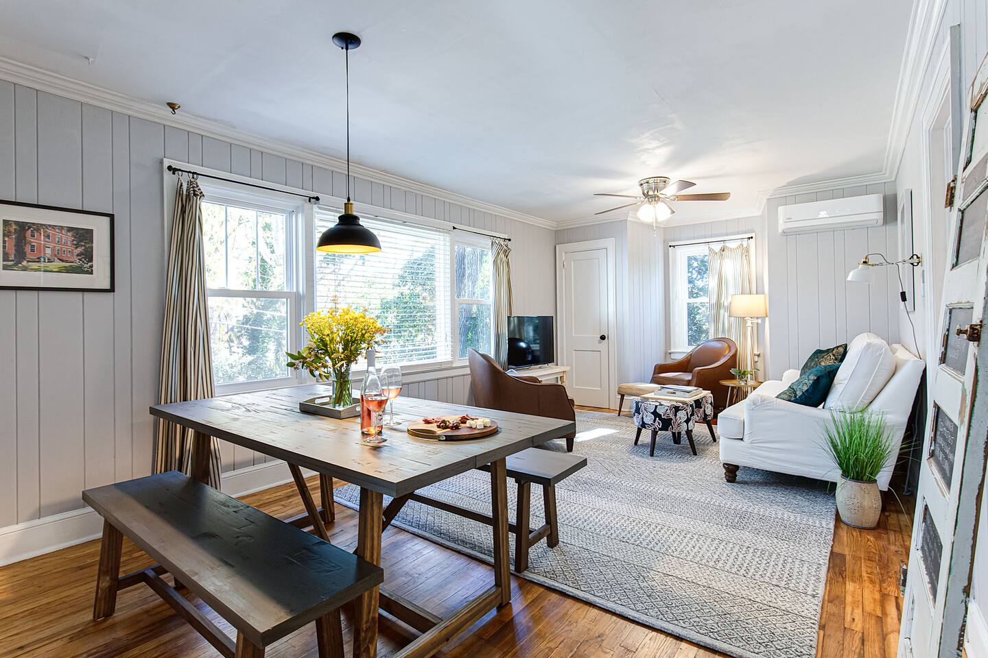 One bedroom, one bathroom apartment with a full kitchen, and loaded with charm and character. Newly updated and renovated. Relax inside in the cozy living room with the HDTV and comfy sofa, or enjoy the historic homes and UGA campus just down the street. The bedroom features a queen memory foam bed. The living room features a comfortable sofa for lounging, two leather chairs, three ottomans, and a 42-inch flat screen Roku TV. Enjoy tv provided by cable and streaming channels such as Netflix, Amazon, ESPN, HBO, Starz, Showtime, and more. The bedroom features a queen size memory foam mattress, blackout curtains, two large mirrors, a luggage rack, closet space with hangers, and drawers for storage. The kitchen features a full refrigerator, full range with oven, coffee maker, pots and pans, and dishes and silverware for your stay. There are two spaces to sit and eat. A two-seat table in the kitchen and a 4 seat dining table in the main living space. The patio space out front features a two-seat bench and two individual seats. Surrounded by plants and outdoor lighting, this space lights up at night.