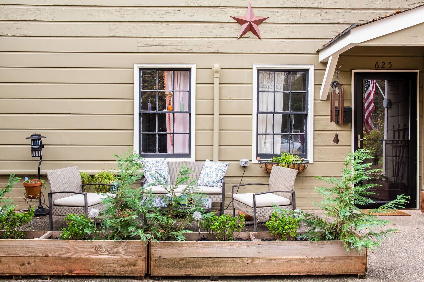 The upstairs apartment and the front patio. Access the unit via a private staircase and keyless entry. There is one dedicated parking spot for this rental, as well as street parking directly in front of the house.